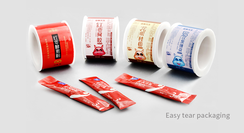 3、Easy-to-tear packages: convenient and quick to be removed with smooth and linear split, environment-friendly. Easy to tear without compromising barrier performance of products or loss of product nutrition. Widely used as packages for dairy products, food, drugs and dietary supplements in forms of powder and oral preparation, compatible with medium- and high-speed automatic packing machines