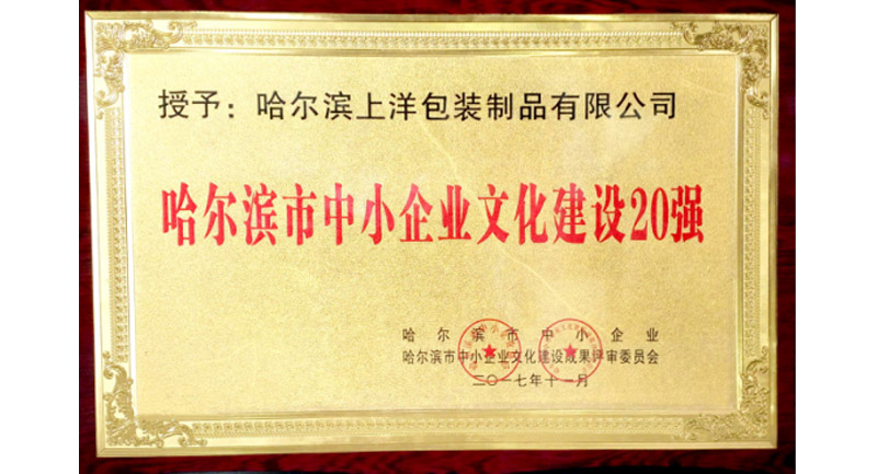 In Nov. 2017, Shangyang Packaging was honored as Top 20 Small- and Medium-sized Corporate Culture Constructor of Harbin. Corporate culture is the soul of a company, and this honor is a testimony to soft power of Shangyang Packaging.